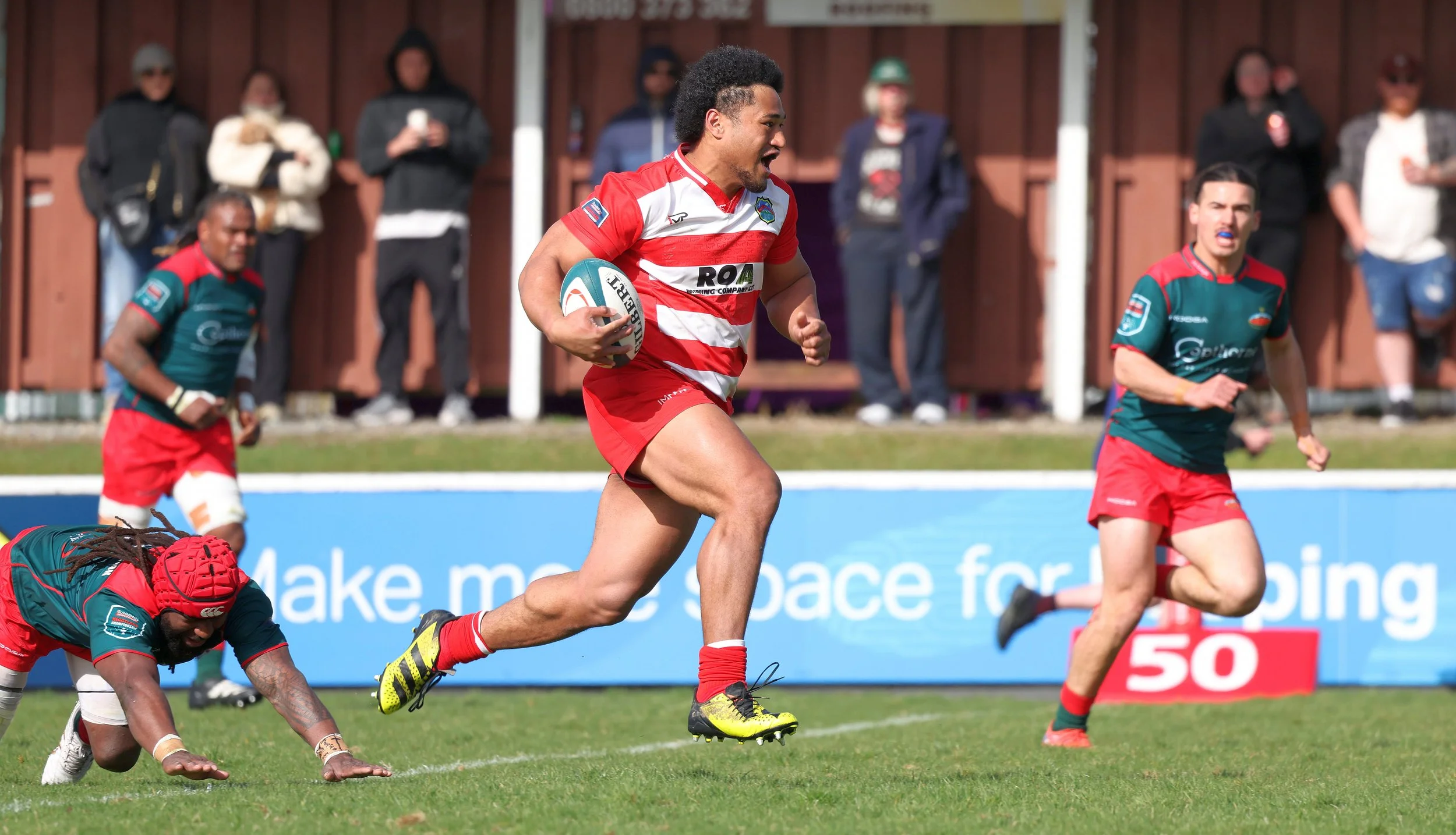 Isi Saumaki, West Coast centre, in full flight. His run led to another try for the home team.